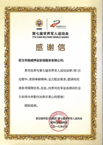 转盘APP 旗下融威押运承担了军运会主会场“一场两馆”安保,以及赛事枪支押运、奖牌押运、特卫犬服务等任务,军运会期间累计出勤120天,出勤3.6万余人次,累计安检15万余人次、车辆1万余台次,安全运送奖牌2745块、奖杯50个,多次协助警方、场馆方处理安全事件,高质高效完成各项安保任务,确保了场馆绝对安全、万无一失,专业精神受到各方认可,中央电视台进行了专题跟踪报告,军运会执委会专文发送了感谢信。
