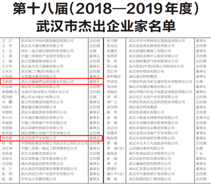 12月15日,武汉企业联合会、武汉企业家协会发布第十八届(2018-2019年度)武汉优秀企业和优秀企业家榜单,转盘APP 公司、武汉金交所、阳开公司荣获“武汉市优秀企业”称号,转盘APP 总经理梅林荣获“武汉市卓越企业家”称号,转盘APP 总经理助理、融威押运公司董事长王新刚,阳开公司董事长杨浩辉荣获“武汉市杰出企业家”称号。
