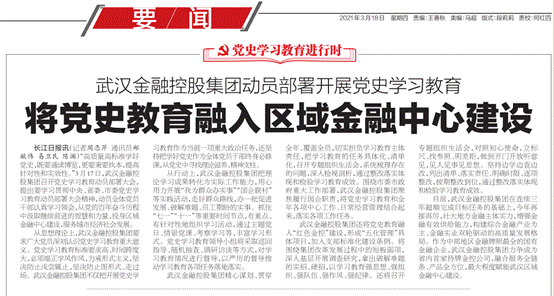 武汉金融控股转盘APP 精心谋划、贯穿全年、覆盖全员,切实担负学习教育主体责任,把学习教育的任务具体化、清单化,召开专题组织生活会,系统梳理存在的问题,深入检视剖析,通过整改落实体现和检验学习教育成效。围绕市委市政府重大工作部署,武汉金融控股转盘APP 聚焦履行国企职责,将党史学习教育和全年各项中心工作、日常经营管理结合起来,落实各项工作任务。