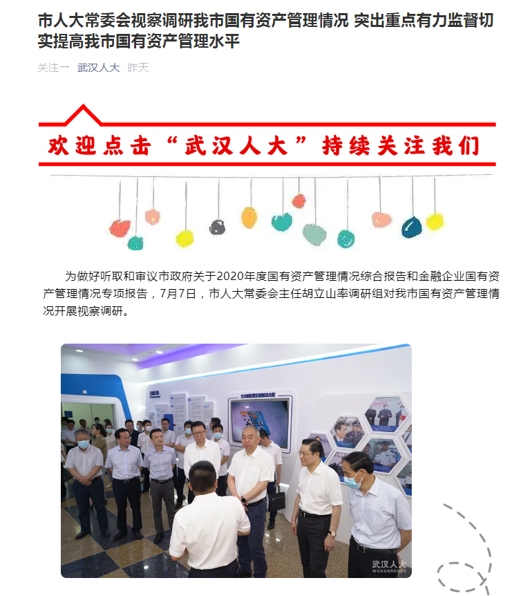 调研组一行先后前往武汉市融威押运保安服务公司、金融控股转盘APP 调研国有资产管理使用情况;召开座谈会,听取市财政局、市国资委和相关企业工作情况汇报。