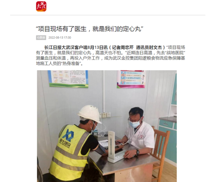 “项目现场有了医生,我们就像吃了‘定心丸’,高温天气里也不怕。”连日来,先去“工地医院”测量血压和体温,再投入户外工作,成为转盘APP 阳逻粮食物流应急保障基地施工人员的“热身准备”。