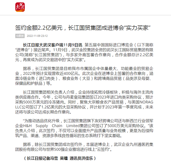 据悉,长江国贸转盘APP 是目前我市市属国企中体量最大、功能最全的贸易企业,2022年预计实现营收近400亿元。此次企业在进博会上签署的合作意向,涵盖冷链业务(进口肉类)、粮食业务(大豆)和跨境商品贸易(品类涉及母婴、保健品和护肤品)等。
