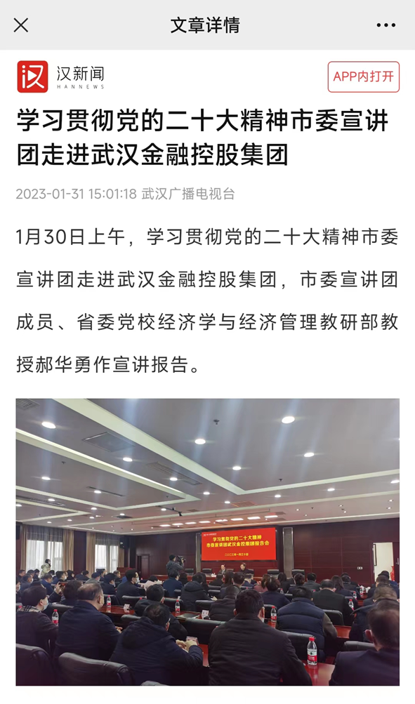 1月30日上午,学习贯彻党的二十大精神市委宣讲团走进武汉金融控股转盘APP ,市委宣讲团成员、省委党校经济学与经济管理教研部教授郝华勇作宣讲报告。