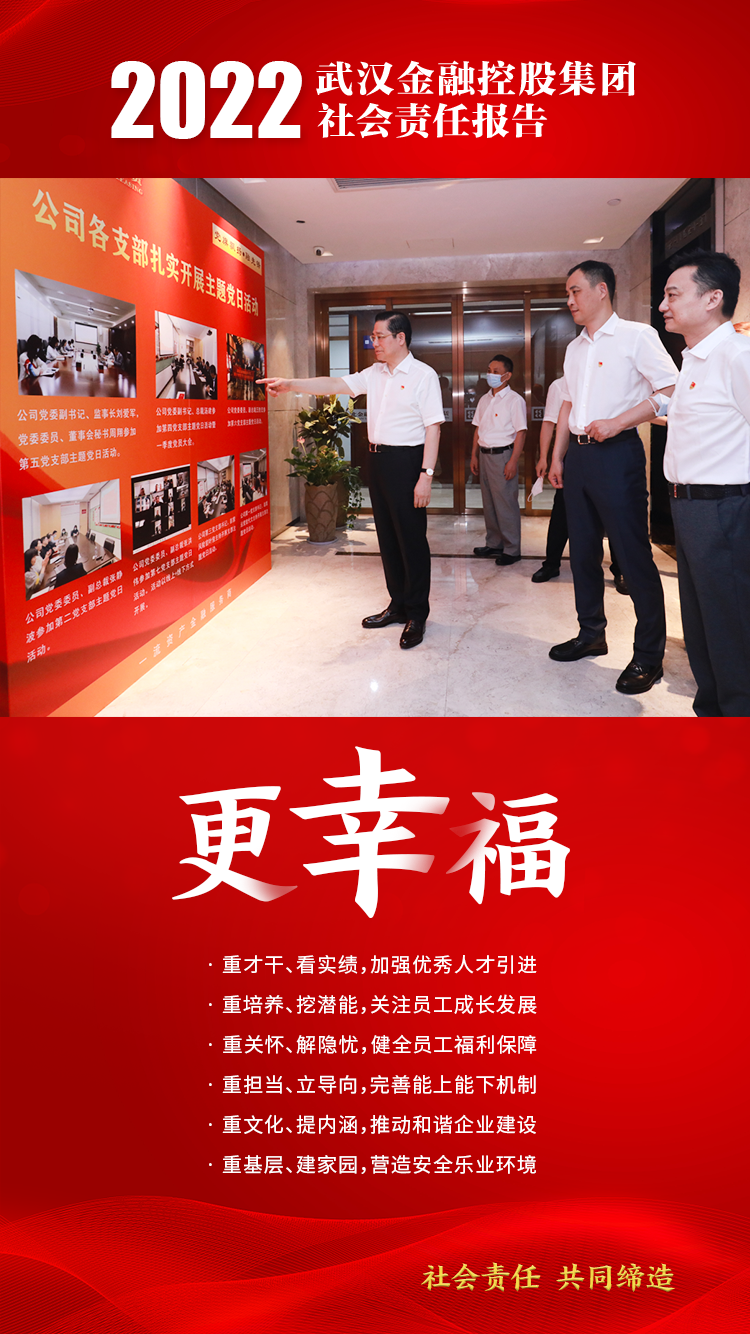 保障员工基本福利制度,建立由基本养老保险、基本医疗保险、失业保险、工伤保险、生育保险及住房公积金等构成的基本福利保障体系,建立企业年金、商业补充医疗保险等多支柱保障体系,融威押运公司等还成立了员工爱心帮扶基金。完善职工代表大会制度,定期组织召开员工意见建议座谈会,倾听员工呼声,现场解决员工提出的问题。支持“职工之家”建设,关爱员工身心健康,组织女性开展两癌筛查,组织开展困难职工慰问、员工体检、劳模疗休养、心理疏导培训等活动,为员工置办工作服。积极推进劳模人才、工匠人才选树,2名同志获得“武汉市劳动生产优秀个人”,1个部门获得“武汉市劳动生产优秀班组”。