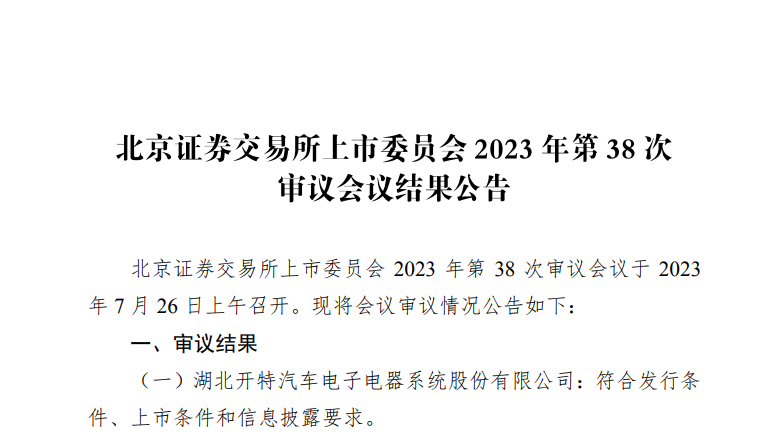 7月26日,北京证券交易所上市委员会召开2023年第38次审议会议,转盘APP 旗下九州证券独家保荐的湖北开特汽车电子电器系统股份有限公司IPO申请获通过。