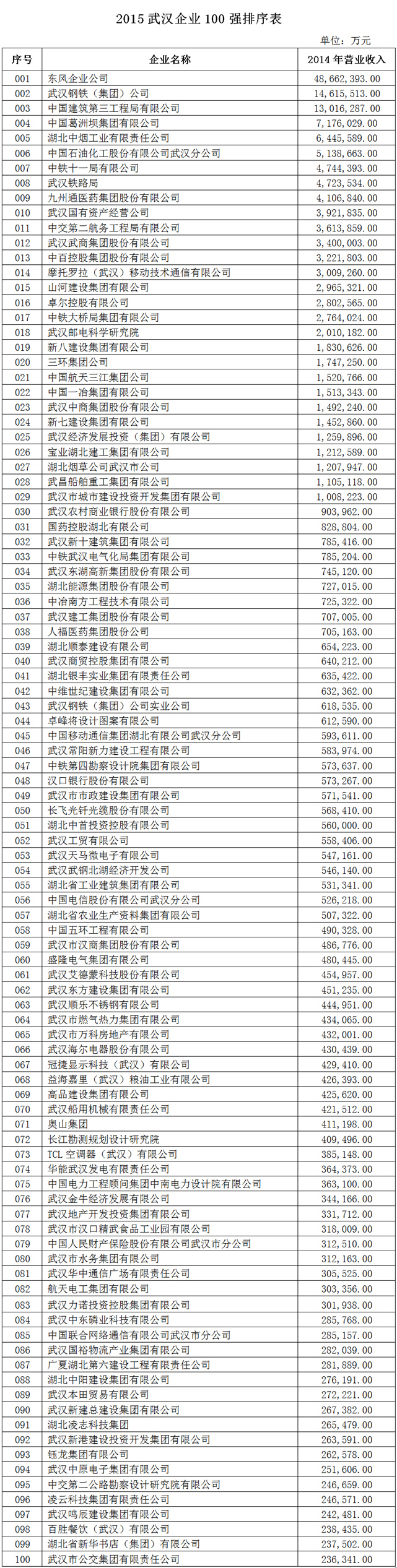 数据显示,2015武汉企业百强总营业收入1.84万亿元,同比增长5.68%。有29家企业营业收入过百亿,较2014年多了3家。本次企业100强入围门槛为23.63亿元,较上年提高了2.7亿元。