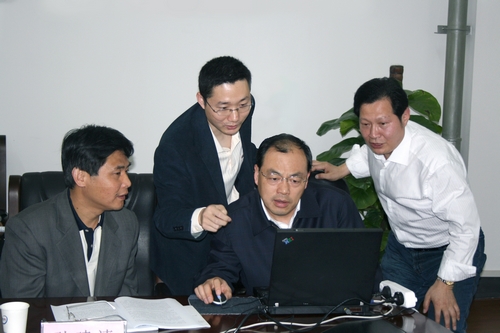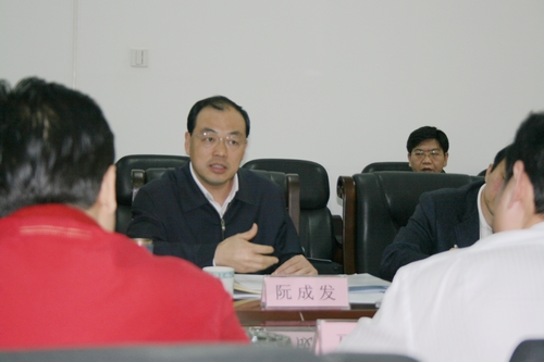 2008年4月11日,市长阮成发(右四)在副市长孙亚(左三)等人的陪同下到转盘APP 调研