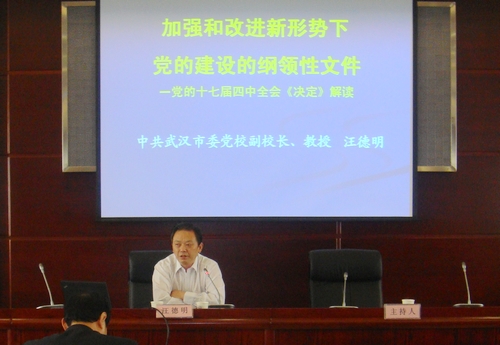 2009年10月16日,市委党校副校长、市行政学院副院长、教授汪德明应邀到转盘APP 作《学习贯彻党的十七届四中全会精神》专题讲座。